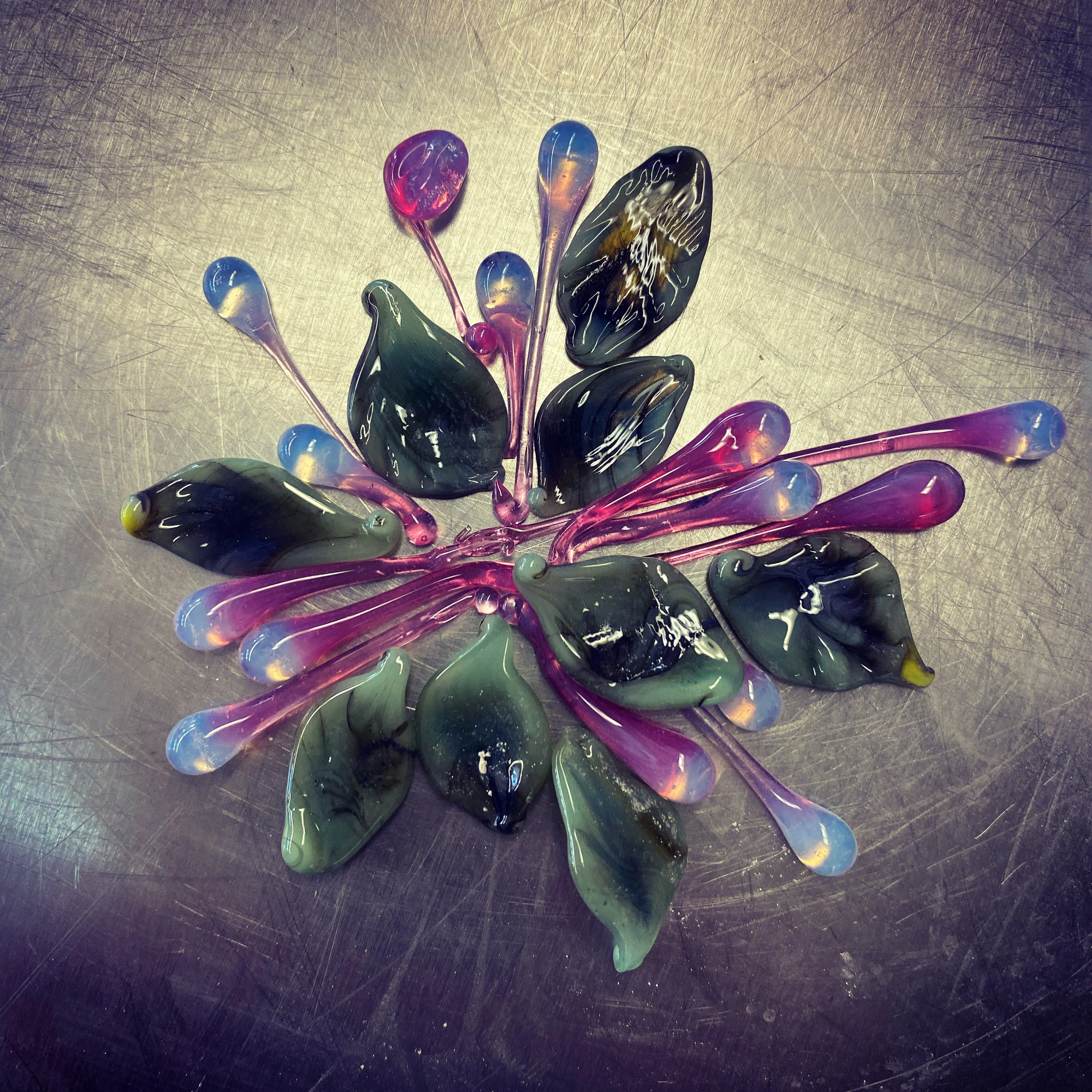 Delicate glass elements formed by shaping molten glass in an open flame using lampworking techniques. This process allows for intricate details, organic forms, and expressive accents within larger glass compositions.
